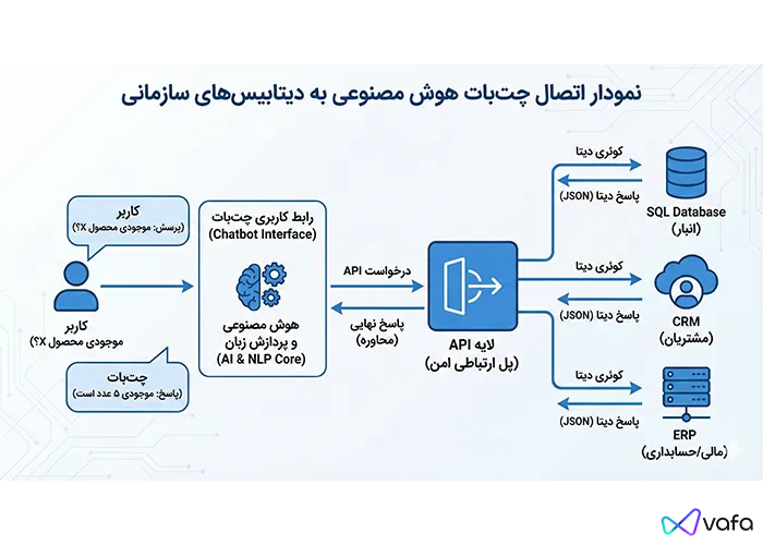 چگونه چت بات را به دیتابیس سایت وصل کنیم؟ راهنمای جامع اتصال هوش مصنوعی به SQL و API برای استعلام لحظهای موجودی و سفارشات + معرفی ابزار وفا. کلیک کنید!